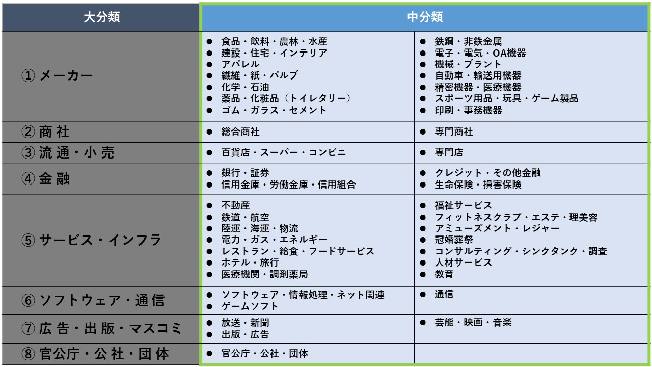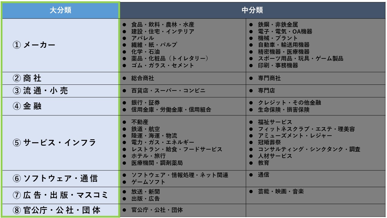 まずは世の中にある業界をざっくりと知るために、大分類の8グループを見ていきましょう!