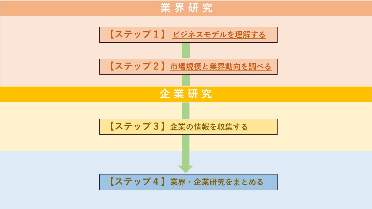 ここからは業界研究と企業研究の両方を通して、自分に合う仕事を選ぶ方法を4ステップでご紹介します。