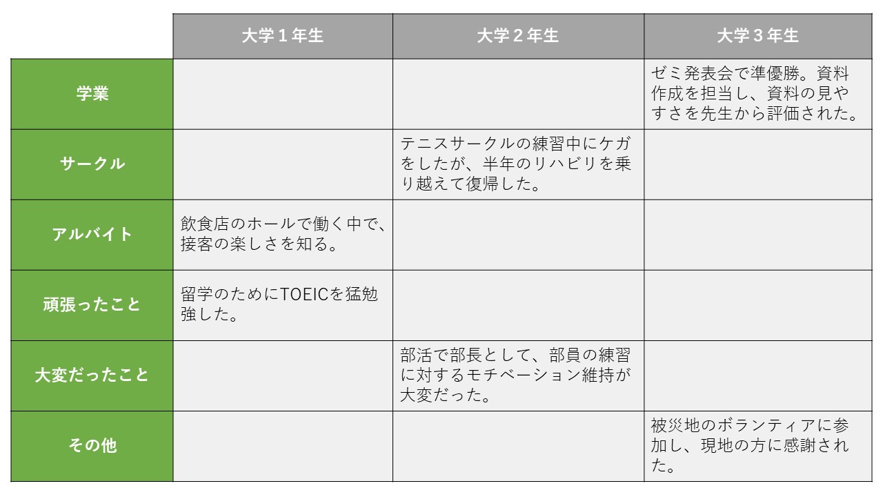 経験した活動の規模や大会の成績ではなく、その中での役割や与えた影響などが大事です。