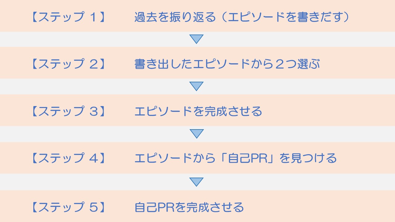 ここでは、自分の過去の「エピソード」から自己PRとなる「長所・強み」を見つける方法を5ステップで紹介します。