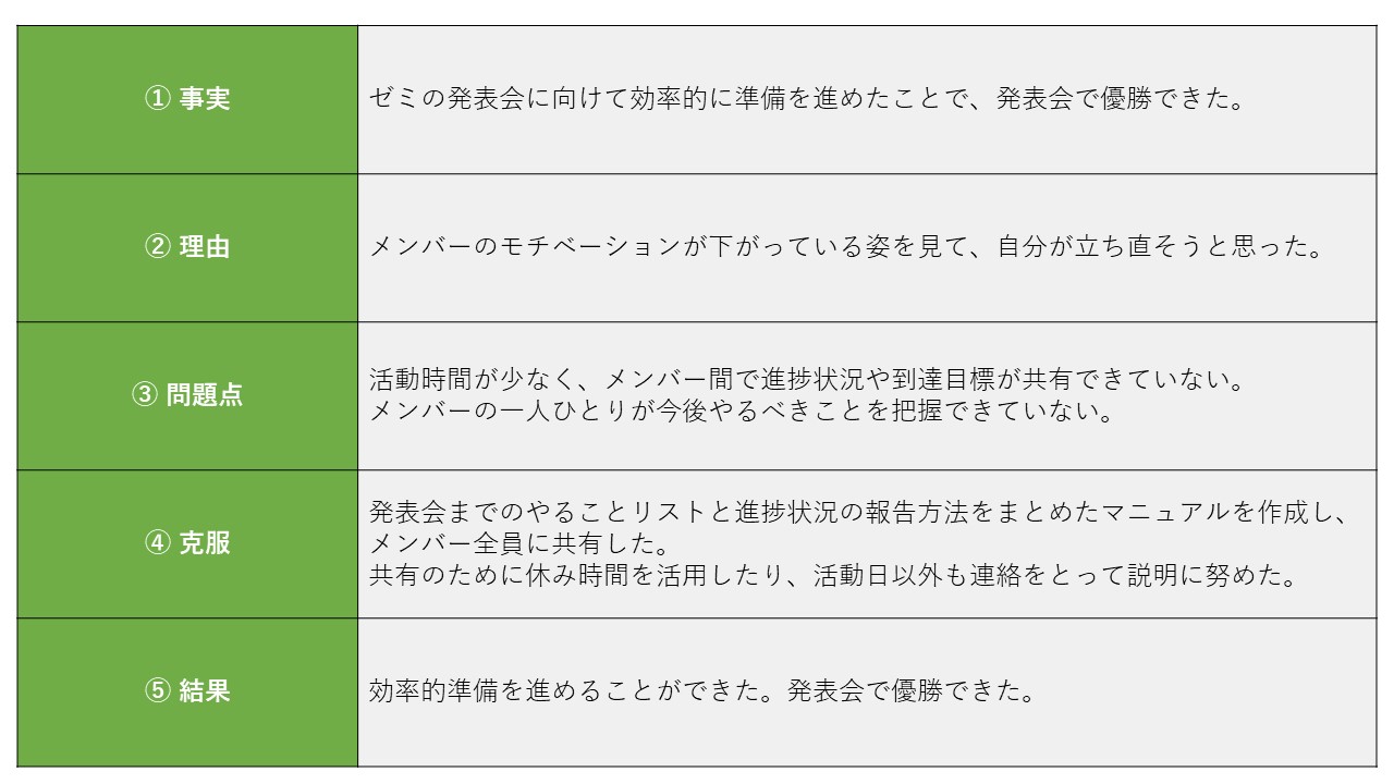 ⑤ 結果:克服した結果、どうなったかを記入する。可能であれば具体的な数字やデータなどもあると良いです。
