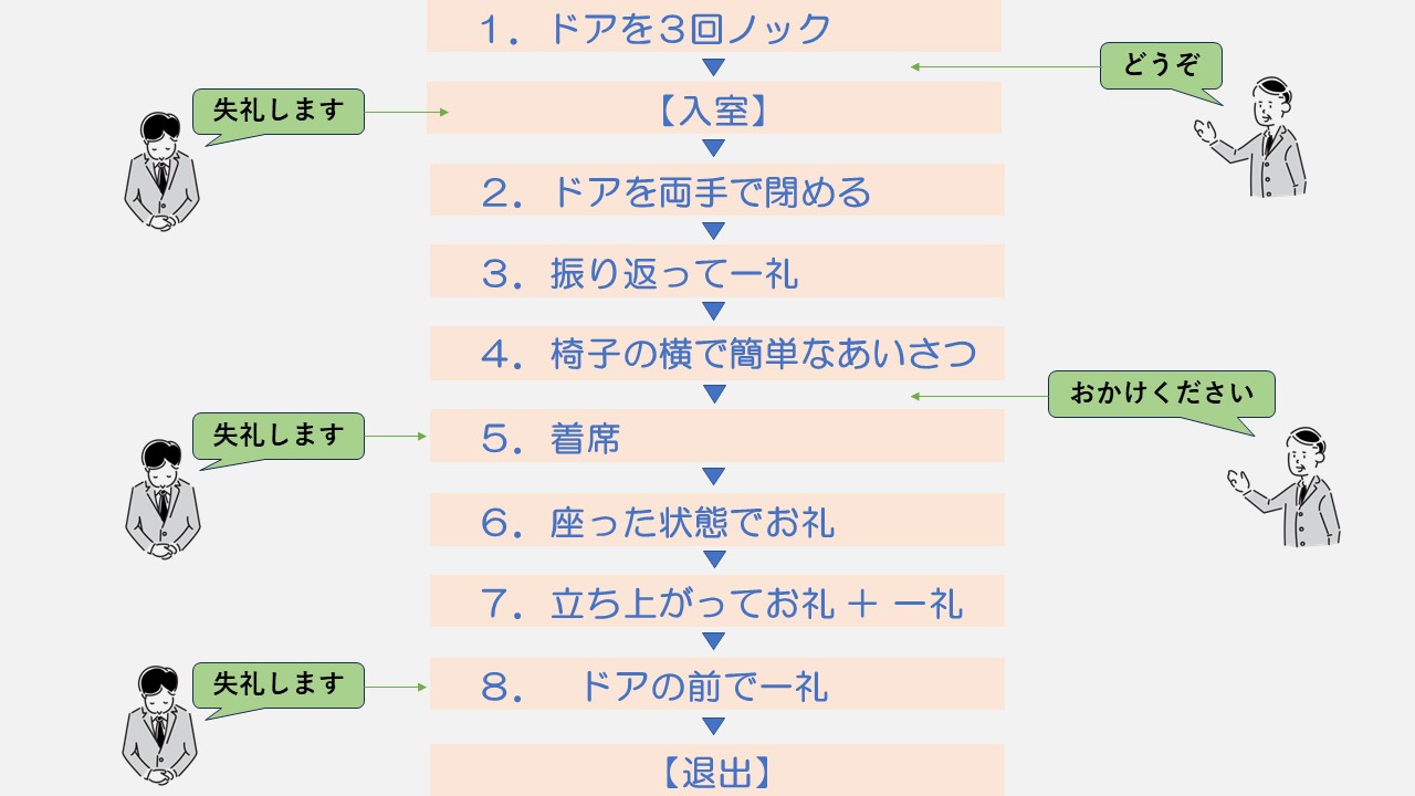 入室から退出までの基本の流れを理解して、マナーと振る舞いを身につけましょう。